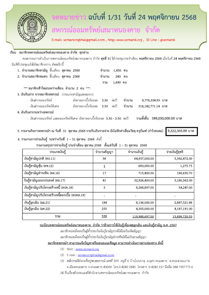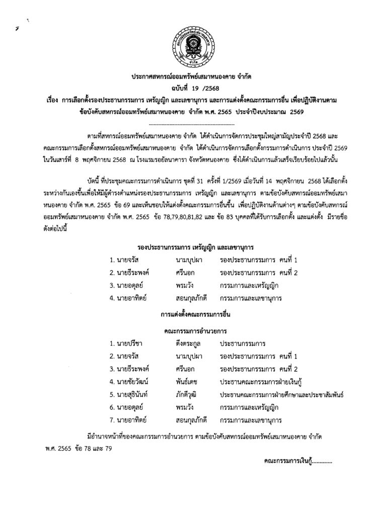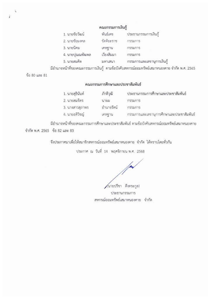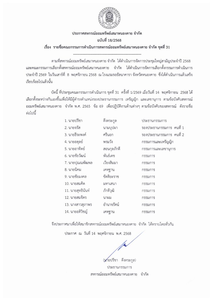 รายชื่อคณะกรรมการดำเนินการสหกรณ์ออมทรัพย์เสมาหนองคาย จำกัด ชุดที่ 31พ.ย. 25, 2025wpsemankประกาศสหกรณ์