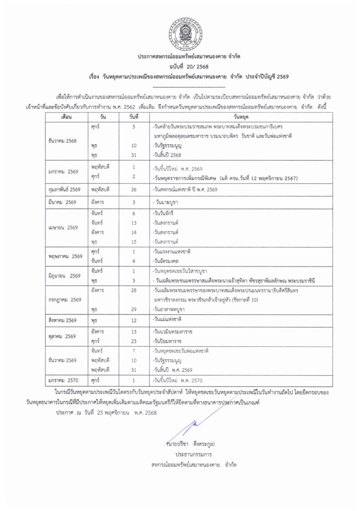 วันหยุดตามประเพณีของสหกรณ์ออมทรัพย์เสมาหนองคาย จำกัด ประจำปีบัญชี 2569พ.ย. 26, 2025wpsemankประกาศสหกรณ์