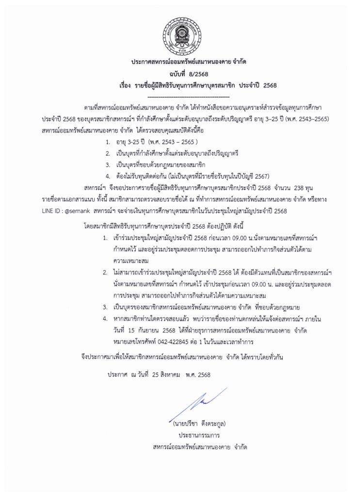 รายชื่อผู้มีสิทธิรับทุนการศึกษาบุตรสมาชิก ประจำปี 2568ก.ย. 1, 2025wpsemankประกาศสหกรณ์ตามลิงค์นี้ได้เลยค่ะ>>>https://bit.ly/45Jp1rt